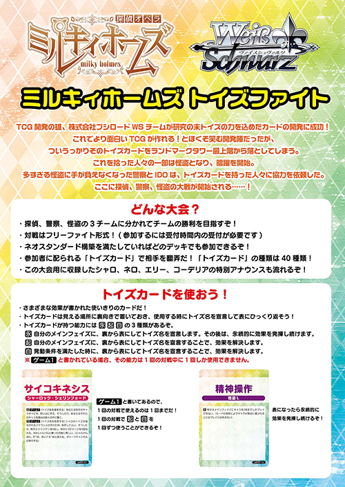「探偵オペラ ミルキィホームズ」シリーズに登場する様々なトイズや出来事を再現した「トイズカード」を駆使する新感覚ヴァイスシュヴァルツ! |